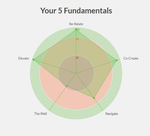 - Your score across the critical domains of Re-relate, Co-create, Navigate, The Well and Elevate.